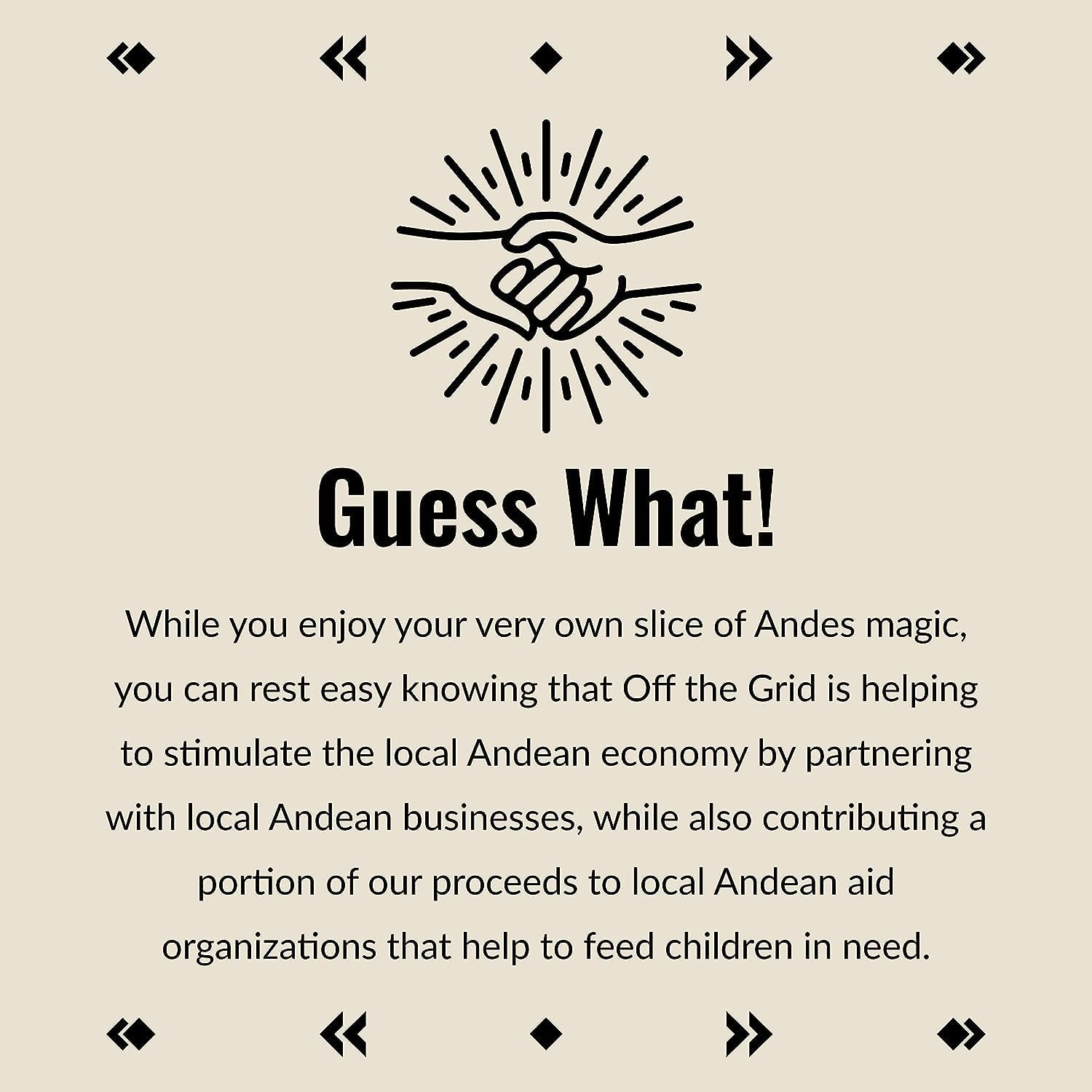 - SOCIALLY RESPONSIBLE: While you enjoy your very own slice of Indian Andes magic, you can rest easy knowing that Off the Grid is helping to stimulate the local Andean economy by partnering with native Andean businesses, while also contributing a portion of our proceeds to local Andean aid organizations that help to feed children in need.